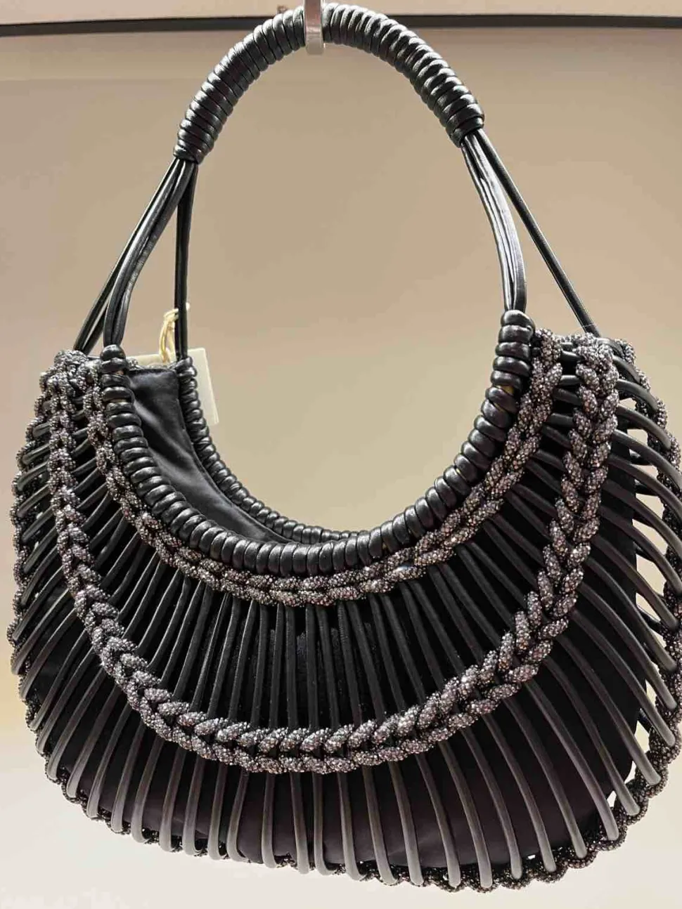 Borsa realizzata in tubolare ecopelle ed impreziosita da fili di cristallo